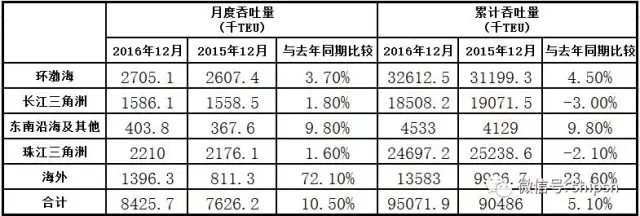 2016年1-12月,中远海运港口累计完成集装箱吞吐量9507.19万TEU,较去年同期增长5.10%。其中,海外部分成为该港口的新增长点,2016年全年完成集装箱吞吐量1358.3万TEU,同比激增23.6%;东南沿海及其他地区完成集装箱吞吐量453.3万TEU,同比增9.8%,与海外部分一起,成为该公司唯一两个增速超过均值5.10%的区域;环渤海地区完成集装箱同比增长4.5%至3261.25万TEU;受全球经贸的影响,以对外经济为主的长江三角洲与珠江三角洲地区分别完成集装箱吞吐量1850.82万TEU和2469.72TEU,分别同比减3%和5.1%。值得注意的是,海外码头中,Kumport Liman Hizmetleri ve Lojistik Sanayive Ticaret A.? 及CJ Korea Express Busan Container Terminal Corp. (“KBCT”) 两个码头的吞吐量均于2016年1月计入该港口;而Euromax Terminal Rotterdam B.V. 的吞吐量于2016年10月1日计入该公司;而2016年11月KBCT与Busan International Terminal Co., Ltd.整合后,中远海运集团仍持有该合资公司Busan Port Terminal Co. Ltd (“BPT”)5.5%的股份。