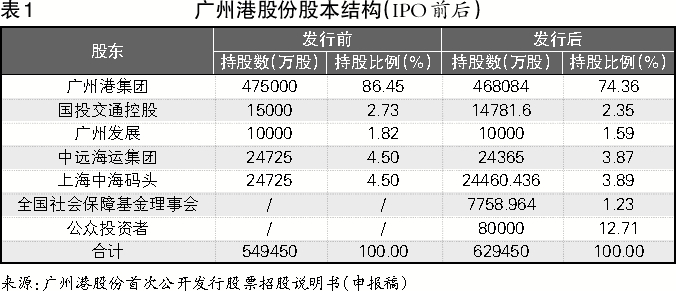 广州港股份成立于2010年12月28日,由广州港集团、国投交通控股、广州发展共同发起设立。根据广州港股份首次公开发行股票招股说明书(申报稿)披露,广州港股份此次发行包括新股发行和股东公开发售股份,占发行后总股本的比例不低于10%、不超过 12.71%,且不超过8 亿股(按照最大规模计算,此次发行前后广州港股份的股本结构见表1)。