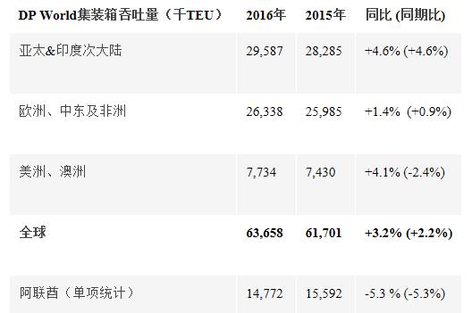 中国航贸网 据迪拜港口世界公司(DP World)发布的最新数据显示,该公司在全球范围内港口集装箱吞吐量同比增长3.2%至 6370万标准集装箱(TEU),同期比(like for like)增涨2.2%。