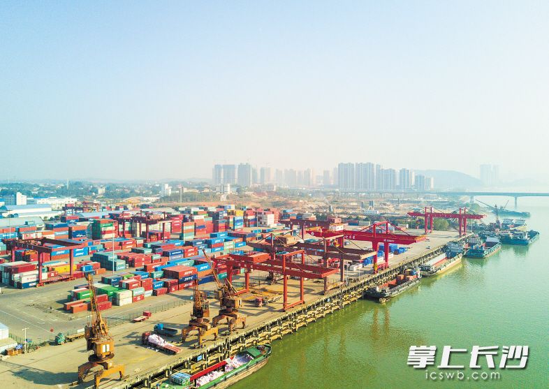 长沙新港,港区“通江达海,物流全球”的标语格外显眼。