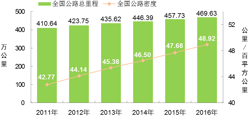 年末全国公路总里程469.63万公里,比上年增加11.90万公里。公路密度48.92公里/百平方公里,增加1.24公里/百平方公里。公路养护里程459.00万公里,占公路总里程97.7%。