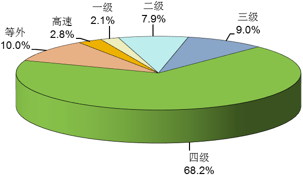 年末全国四级及以上等级公路里程422.65万公里,比上年增加18.03万公里,占公路总里程90.0%,提高1.6个百分点。二级及以上等级公路里程60.12万公里,增加2.63万公里,占公路总里程12.8%,提高0.2个百分点。高速公路里程13.10万公里,增加0.74万公里;高速公路车道里程57.95万公里,增加3.11万公里。国家高速公路9.92万公里,增加1.96万公里。