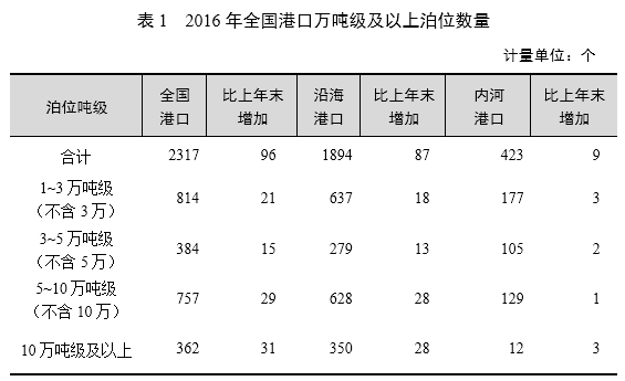 年末全国港口拥有万吨级及以上泊位2317个,比上年增加96个。其中,沿海港口万吨级及以上泊位1894个,增加87个;内河港口万吨级及以上泊位423个,增加9个。