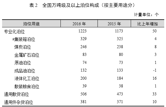 全国万吨级及以上泊位中,专业化泊位1223个,比上年增加50个;通用散货泊位506个,增加33个;通用件杂货泊位381个,增加10个。