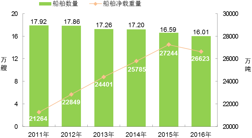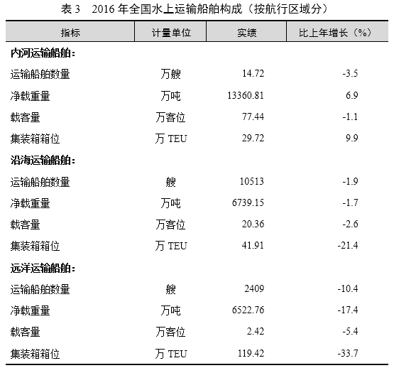 年末全国拥有水上运输船舶16.01万艘,比上年减少3.5%;净载重量26622.71万吨,减少2.3%;载客量100.21万客位,减少1.5%;集装箱箱位191.04万标准箱,减少26.6%。