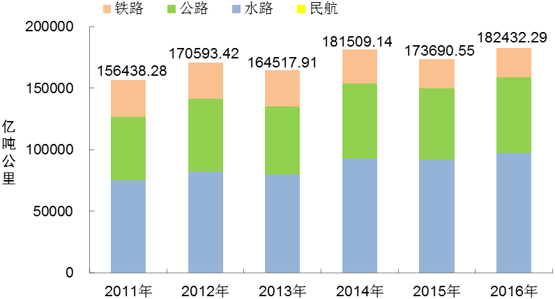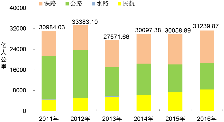 2016年,全社会完成营业性客运量190.02亿人,比上年下降2.2%,旅客周转量31239.87亿人公里,增长3.9%,货运量431.34亿吨,增长5.2%,货物周转量182432.29亿吨公里,增长5.0%。