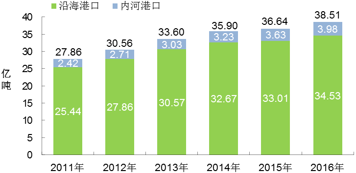 全国港口完成货物吞吐量132.01亿吨,比上年增长3.5%。其中,沿海港口完成84.55亿吨,增长3.8%;内河港口完成47.46亿吨,增长3.1%。