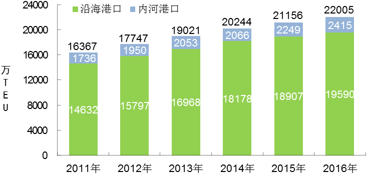 全国港口完成集装箱吞吐量2.20亿TEU,比上年增长4.0%。其中,沿海港口完成1.96亿TEU,增长3.6%;内河港口完成2415万TEU,增长7.4%。