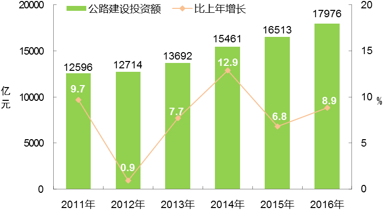 全年完成公路建设投资17975.81亿元,比上年增长8.9%。其中,高速公路建设完成投资8235.32亿元,增长3.6%;普通国省道建设完成投资6081.28亿元,增长14.0%;农村公路建设完成投资3659.20亿元,增长13.4%,新改建农村公路29.90万公里。