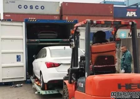 国际船舶网 4月18日,20辆奇瑞汽车依次驶入中远海运集团拥有100多项专利技术的汽车专用支架的专用集装箱,经过海路抵达营口港后,它们将“转乘”汽车前往目的地沈阳。这标志着奇瑞汽车整车集装箱全程物流项目正式启动。首批20辆奇瑞汽车在装船发往营口港拆箱后,将由汽运送到最终目的地沈阳。