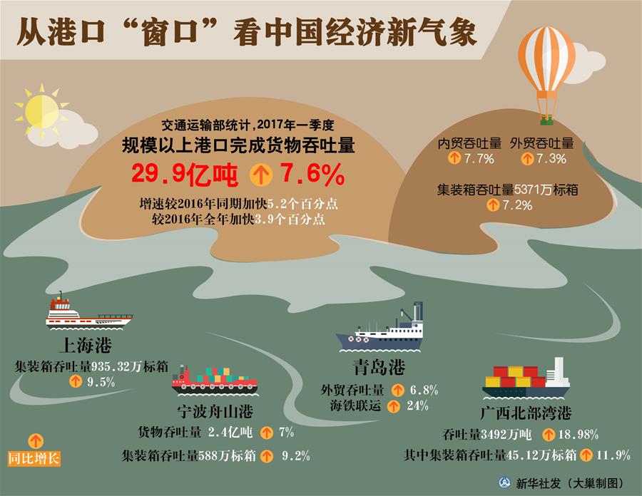 “今年一季度,中国经济同比增长6.9%,实现2015年第四季度以来的最高增速。”交通运输部水运局副局长姜明宝分析认为,一季度国内港口生产呈现回暖升温走势、实现开门红的背后,是受国内消费、生产、流通等领域持续升温及新航线开辟等因素影响,与一季度全国经济走势保持同步。