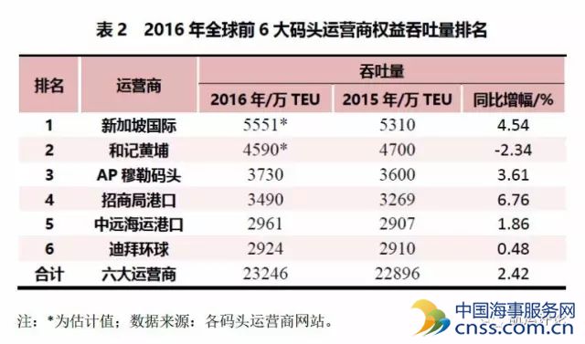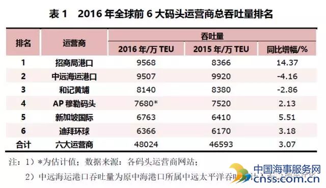 航运评论 2016年,全球码头运营商环境逐渐出现回暖趋势,如北美东部、大洋洲及中国部分港口均呈现良好的运营态势。其中,中远海运的成立使得原中远太平洋整合了原中海码头的资源,使得整体总吞吐量攀升至第二位,而改名后的招商局港口不仅增长率达14.37%之高,其总吞吐量排名仍占第一,领跑各大全球码头运营商,除此之外,榜单上其余码头运营商排名均未发生变化。