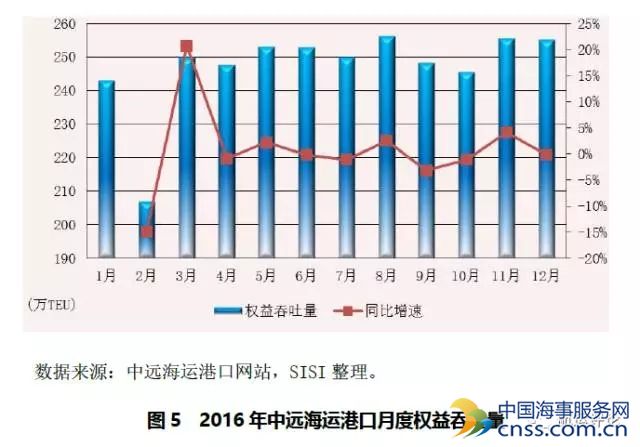 2016年中远太平洋与中海码头两个公司的集装箱码头资产实现彻底合并,并改名为中远海运港口,全年完成集装箱总吞吐量9507.19万TEU;权益吞吐量完成2961万TEU,同比增长1.86%,分月度看,在年初受国内经济下行压力的影响,其权益吞吐量下滑严重,而后其权益吞吐量逐渐回升,并且每月均维持在250万TEU左右,究其原因,一方面是中国港口生产形势的逐渐回暖,另一方面也是中远海运港口在业务重组过程中,集团的管理团队及人才队伍得到了进一步的强化,推动管理创新与商业模式创新的结果。