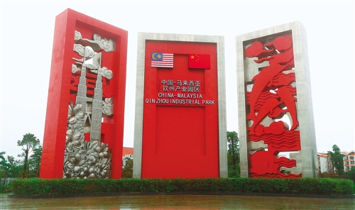 中国-马来西亚钦州产业园区入口。园区依托北部湾港口地理优势,以税收低、物流方便、财政补助等吸引了一批科技金融产业、高新技术项目落户园区。