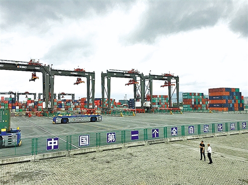 厦门远海全自动化集装箱码头,是国内第一个全智能、零排放、安全、环保的全自动化集装箱码头。