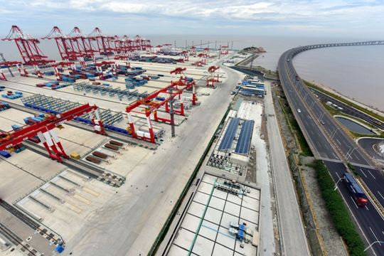 今年我国港口集装箱铁水联运量继续保持高位增长。图为正在建设中的上海洋山港四期工程。摄影/章轲