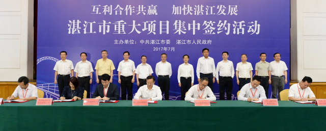 港口圈 7月17日下午,湛江市举行重大项目集中签约活动,在中共中央政治局委员、广东省委书记胡春华,招商局集团董事长李建红,湛江市委书记、市人大常委会主任郑人豪等领导见证下,招商局集团副总经理孙承铭和湛江市市长姜建军分别代表招商局集团和湛江市签署了战略合作协议。
