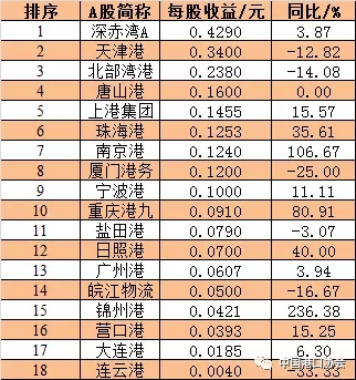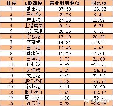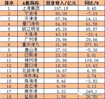 在这18家港口上市公司中,全部盈利,仅有5家公司净利润出现负增长。其中,上港集团年净利润33.73亿,位居行业第一;宁波港、唐山港分别以13.77亿、7.33亿位列第二、第三。其它港口企业经济指标排名请看下面几张图: