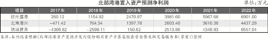“置入资产的持续盈利能力披露不充分”是中国证监会否决资产置换方案的一大核心问题,关于此,北部湾港在最新资产置换草案中对此进行了详细披露,并对2017—2022年的净利润进行了预测(见表)。但尽管如此,新草案并未作出利润承诺。
