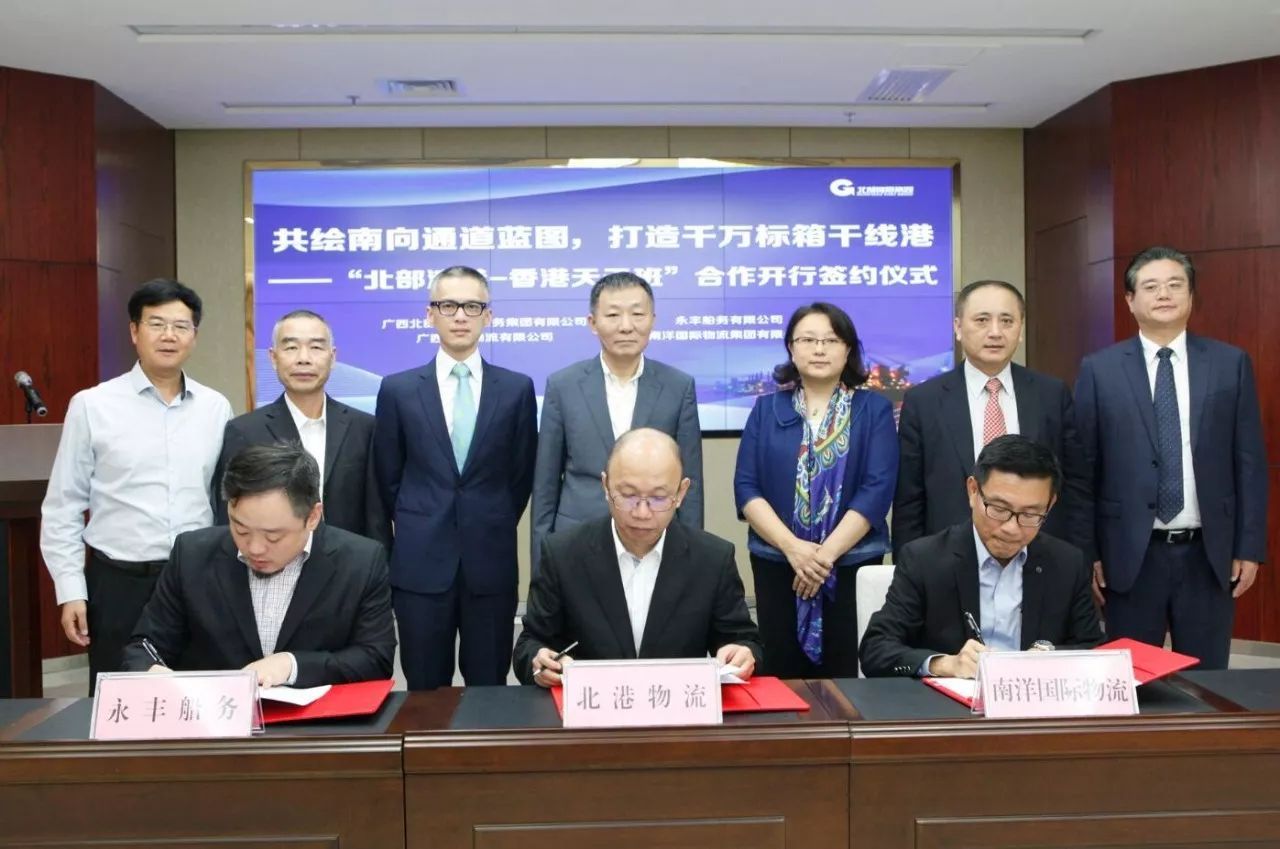 中国航贸网 10月20日,广西北部湾国际港务集团旗下广西北港物流有限公司与香港南洋国际物流集团有限公司、香港永丰船务有限公司在南宁举行合作开行北部湾港至香港“天天班”航线签约仪式,共同增密航线往来,深化“桂港”物流合作,进一步完善南向通道畅通出海条件,助推“向海经济”新发展。