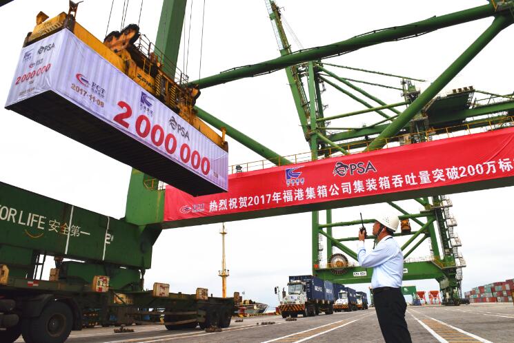做强海铁联运,打造海西辐射内陆的枢纽中心。2017年,福港集箱大力发展海铁联运运输业务,现已开通4条闽赣集装箱海铁联运班列,可为企业提供“水、公、铁”等多式联运运输模式。今年海铁联运到发箱量已达16699.75标箱,同比增长824.2%,年内有望突破2万标箱。为湘、赣、闽北三地企业沿“一带一路”发展提供便捷通道,为船公司在江阴港区开辟干线提供有力货源支撑,进一步提升了江阴港区的全方位服务优势。