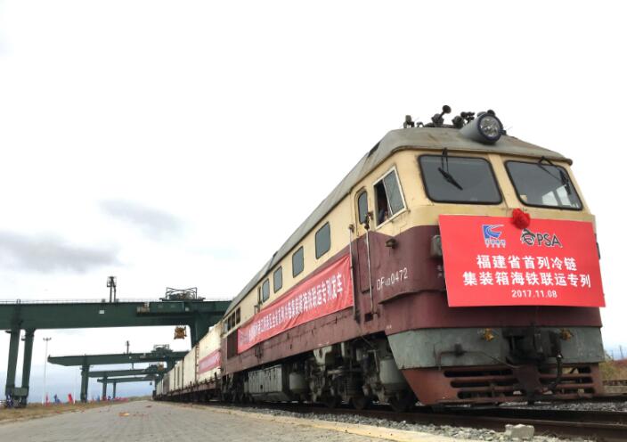 中国航贸网 11月8日,伴随一声火车汽笛声,福建省首列冷链集装箱海铁联运专列在福州港江阴港区发车,装载着进口红酒和冻鱼的8个冷藏集装箱从江阴港区铁路支线驶往内地,标志着冷链集装箱海铁联运车体在福州港江阴港区正式上线运营。此举不仅开启了福建省内冷链物流运输新模式,更为福州港江阴港区在“一带一路”建设中创造陆海统筹新发展、实施港口供应链工程注入了全新动力。