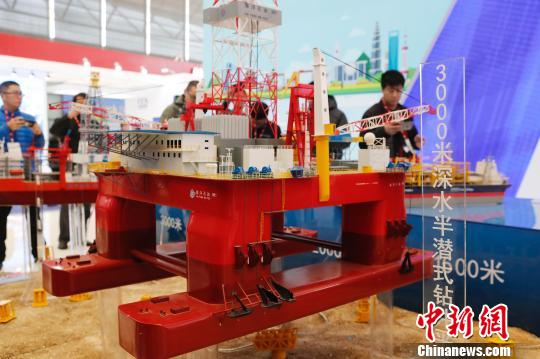 3000米深水半潜式钻井平台海洋石油981模型在展会上展出。(记者 殷立勤 摄影)