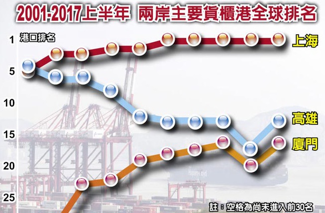 以上海和高雄这两个两岸第一大港为例,从2001至2016年,高雄港集装箱吞吐量从754万TEU增长到1050万TEU,增长39%;上海则从634万TEU增长到3710万TEU,增长高达485%。16年前高雄港领先所有的大陆港口,16年后大陆有6个港口排名在高雄港之前,且厦门和大连港在后急起直追,可能在2年内先后超越高雄港,尤其厦门港就位于海峡对岸的福建,地缘关系接近台湾,对高雄港形成莫大压力。