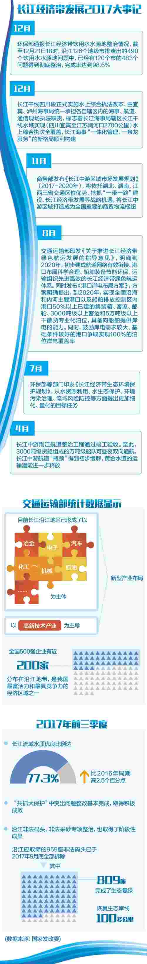 2017年12月13日,推动长江经济带发展领导小组办公室会议暨省际协商合作机制第二次会议在北京召开。会议指出,2018年要重点抓好4方面工作:一是以持续改善长江水质为核心,加快推进水污染治理、水生态修复和水资源保护“三水共治”,切实保护和改善水环境,全面遏制、根本扭转生态环境恶化趋势。二是以推进集装箱江海联运为重点,形成与江海联运相适应的港口、集疏运、航运、船舶、通关等一体化系统,带动构建综合立体交通体系。三是以供给侧结构性改革为主线,推动经济发展质量变革、效率变革、动力变革,着力加快建设实体经济、科技创新、现代金融、人力资源协同发展的产业体系。四是构建“共抓大保护”长效机制。加快推进生态环境保护制度建设,选择有条件的地区开展绿色发展试点示范,充分调动各方面积极性形成共抓大保护合力。