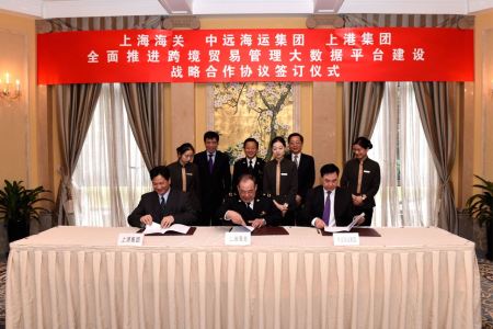 中远海运 2018年1月18日下午,上海海关、中远海运集团、上港集团在上海举行全面推进跨境贸易管理大数据平台建设战略合作协议签字仪式。上海海关关长高融昆、中远海运集团董事长许立荣、上港集团董事长陈戌源出席并见证签约。上海海关副关长黄迂明、中远海运集团副总经理黄小文、上港集团总裁严俊代表三方签署了战略合作协议。