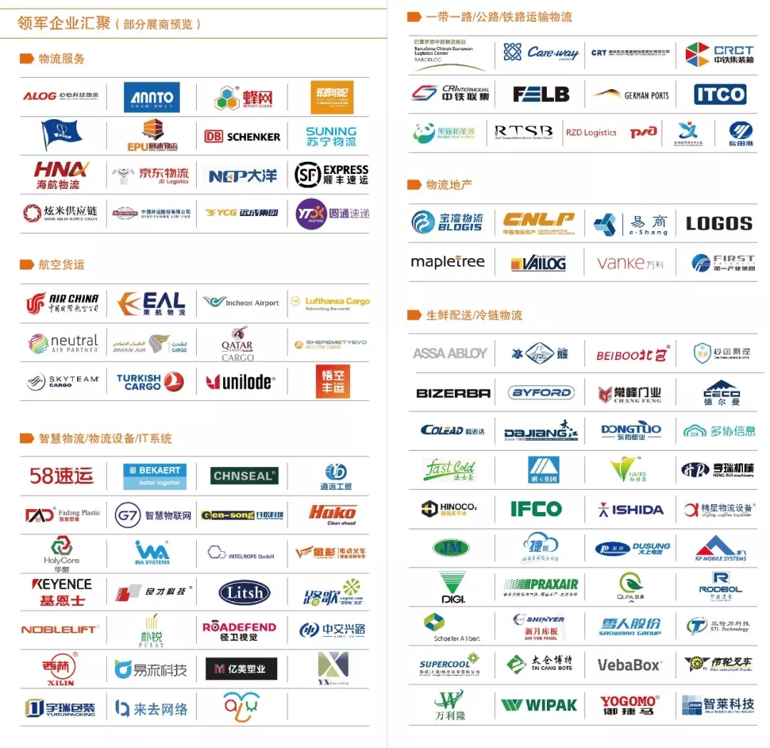 部分已参展企业包括:中国外运、京东物流、顺丰速运、圆通速递、苏宁物流、海航物流、蜂网、DB SHENKER、国货航、东航物流、悟空丰运、德国汉莎、卡塔尔航空、中铁集、熊猫新能源、盐田港、青岛港、58速运、货拉拉、万科、维龙、易商、易流科技、井松科技等。