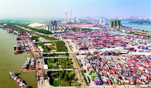 图为:武汉新港阳逻集装箱码头一派繁忙景象。