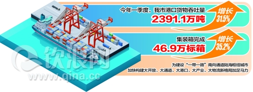 钦州日报 今年一季度,钦州市港口交出优秀成绩单:港口货物吞吐量2391.1万吨,同比增长31.5%;集装箱完成46.9万标箱,同比增长35.2%,为建设“一带一路”南向通道陆海枢纽城市,加快构建大开放、大通道、大港口、大产业、大物流新格局加足马力。