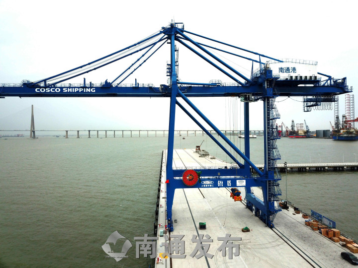 南通发布 4月15日,长江碧波拍打着通海港区码头。临江泊位上,一座高达数十米的蓝色装卸岸桥巍然耸立,桥身上制造商“上海振华重工”的名字和LOGO分外显眼。工人们在这座最大吊载能力达到61吨的庞然大物上忙碌着,为两个半月后的投入使用做着最后的扫尾工作。