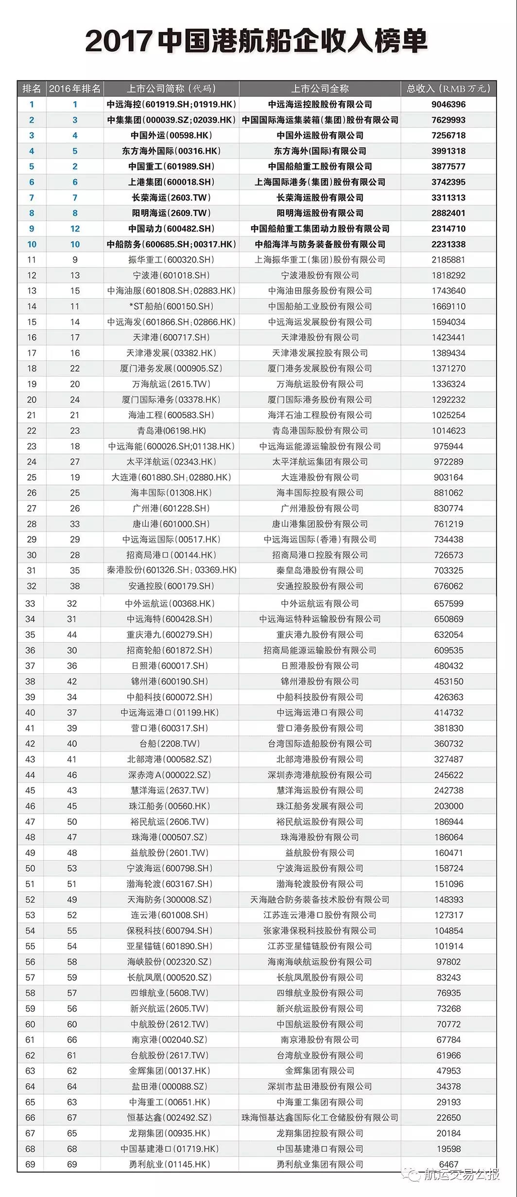 截至2018年4月30日,在两岸四地上市的69家中国港航船企的2017年报全部出炉,亏损企业数目降至6家,营业收入与净利润同比均明显回升,盈利能力达到三年最高水平。