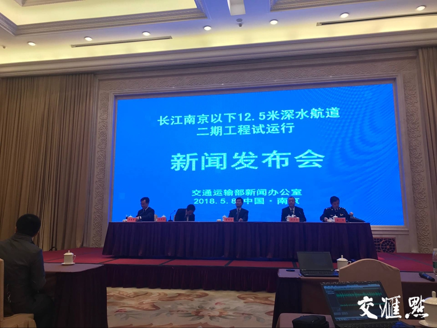 5月8日,交通运输部新闻办公室在南京召开“长江南京以下12.5米深水航道二期工程试运行”新闻发布会。会上宣布:2018年5月8日,长江南京以下12.5米深水航道二期工程正式试运行,对国内外船舶开放航行。南京至长江出海口431公里的12.5米深水航道全线贯通,5万吨级海轮可直达南京港,10万吨级海轮也可减载抵达,标志着长江经济带综合立体交通走廊建设取得重大进展。