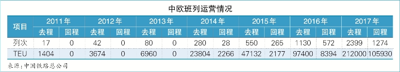 中欧班列俨然已经成为“一带一路”建设的标志性工程。截至2017年年底,中欧班列国内开行城市38座,到达欧洲13个国家36座城市,铺画运行线路达61条。“一带一路”建设的推进,给中欧班列发展带来了无限生机,2013年,中欧班列开行数量仅80列;2017年,中欧班列开行数量迅猛增长,全年开行3673列,超过过去6年的总和。