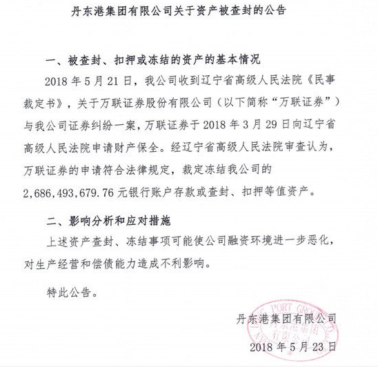 5月23日,丹东港在上海清算所发布资产被查封冻结公告,法院裁定冻结公司26.9亿元银行账户存款或查封扣押等值资产。上述资产查封、冻结事项可能使公司融资环境进一步恶化。