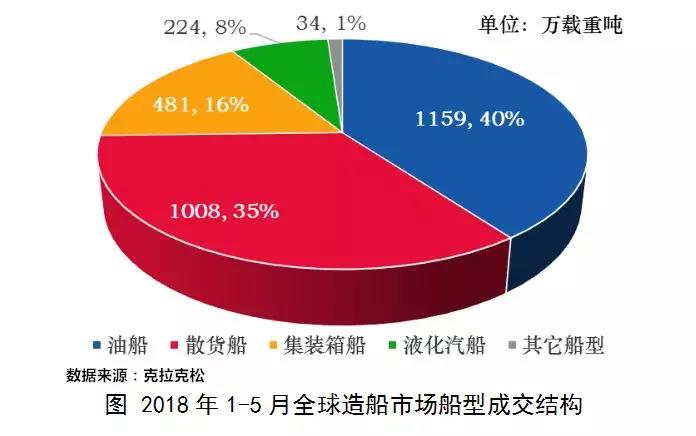 2018年1-5月,主力船型市场均有订单释放。其中:油船成交1159万载重吨,同比减少1.0%;散货船成交1008万载重吨,同比增加39.4%;集装箱船成交43.5万TEU,同比增加356.7%;液化气船成交404.2万立方米,同比增加201.6%。