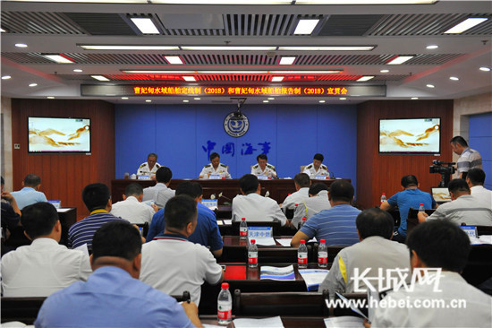 《曹妃甸水域船舶定线制(2018)》和《曹妃甸水域船舶报告制(2018)》宣贯会现场。河北海事局供图