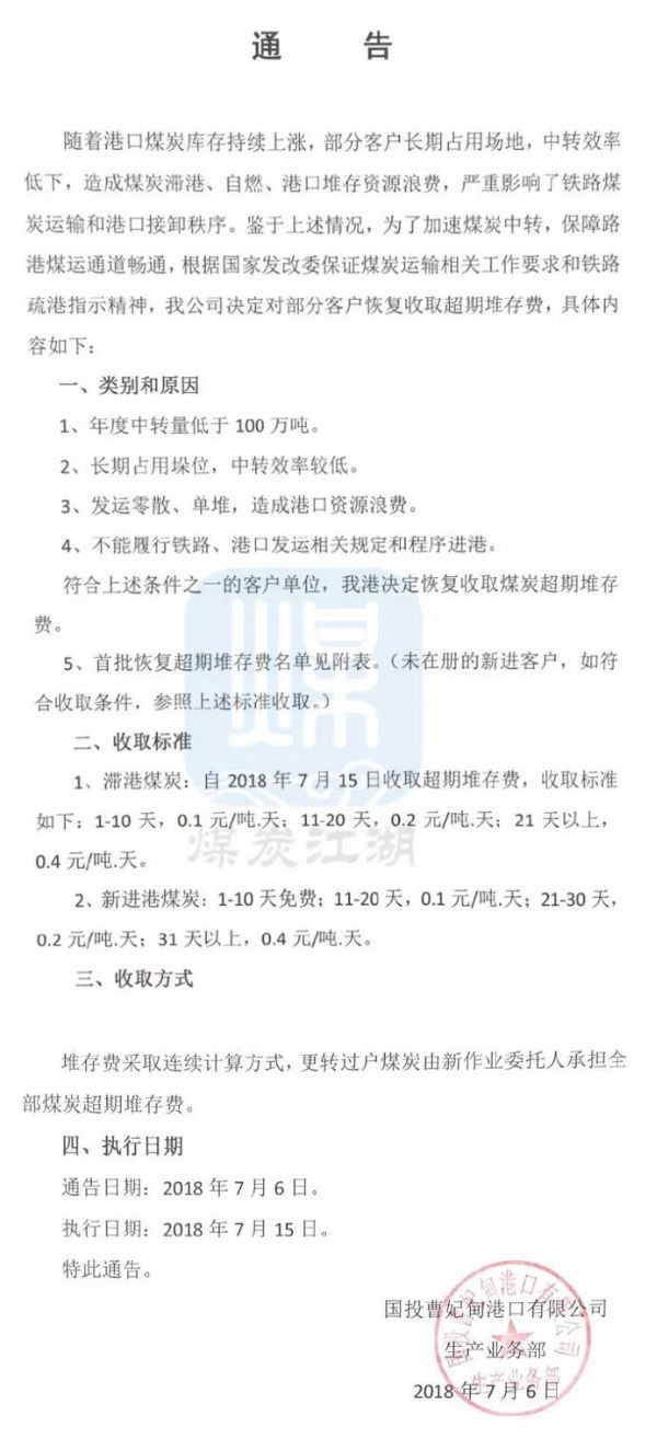 由国投曹妃甸港生产业务部发布的通告显示,为了加速煤炭中转,保障路港煤运通道畅通,根据国家发改委保证煤炭运输相关工作要求和铁路疏港指示精神,国投曹妃甸港将从7月15日开始对部分客户恢复收取超期堆存费,而且还列出了首批恢复超期堆存费的客户名单,并指出未在册的新进客户也将被收取堆存费。