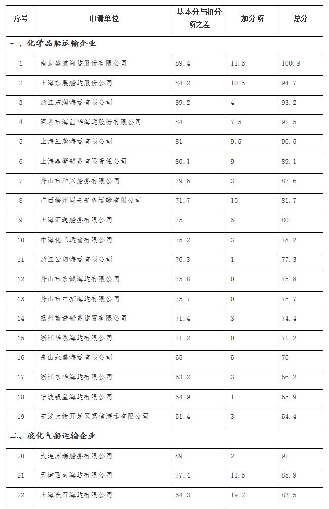 根据《沿海省际危险品水路运输企业新增化学品船液化气船运力综合评价办法》(交办水〔2017〕106号),我局近期组织开展了新增化学品船液化气船运力综合评价工作(2018年第1次),共22家企业参加综合评价,其中新增化学品船运力企业19家,新增液化气船运力企业3家。现将综合评价结果公示如下: