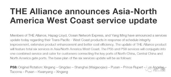 7月6日,Hapag Lloyd在其官网发布公告显示,THE Alliance联盟成员ONE、Hapag Lloyd及Yangming海运决定减少亚洲至美国西海岸航线。