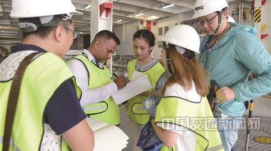 图为采访团成员在靠泊于斯里兰卡汉班托塔港的韩国籍“GLOVIS”轮上采访。 特派记者 林芬 摄
