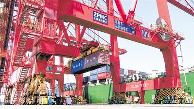 近日,唐山港京唐港区集装箱码头的岸桥正在装卸货物。 记者赵杰 赵海江 摄