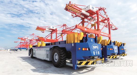 上海港洋山港区四期码头自动化引导运输车驶往目标箱区。