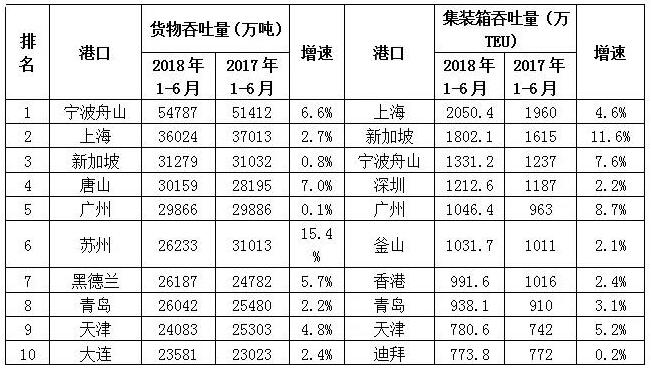 2018年上半年全球top10货物吞吐量及集装箱吞吐量港口生产情况: