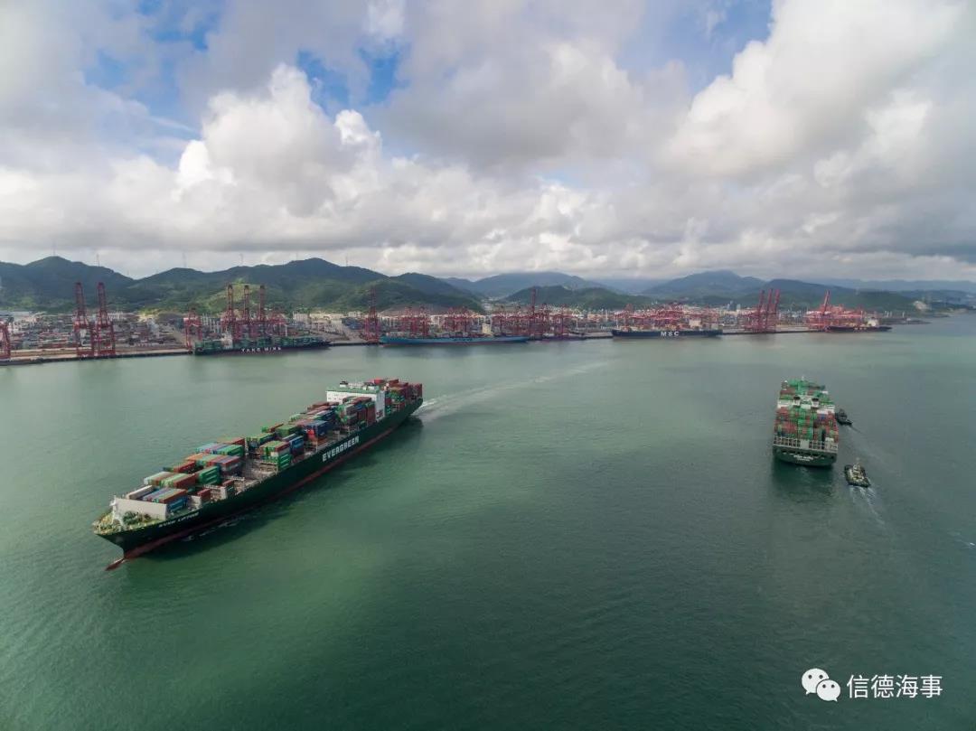图为进出宁波舟山港的全球集装箱货船; 本网浙江传真
