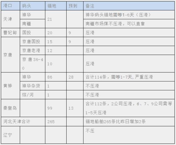 其中,神华黄骅港压港114艘,根据神华黄骅港煤炭船舶运输信息平台显示,锚地及预到船舶确实达到110艘。秦皇岛港压港船舶达112艘。