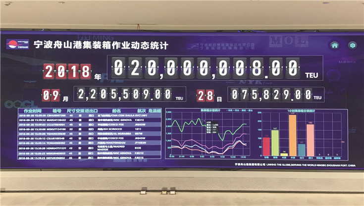 随着宁波舟山港调度指挥中心大屏幕上的集装箱实时生产数据不断刷新,9月28日15时39分,屏幕上的数字跳动至“20,000,000.00”标准箱,这意味着宁波舟山港今年集装箱吞吐量已突破“2000万”,比2017年突破“2000万”提前了近1个月。